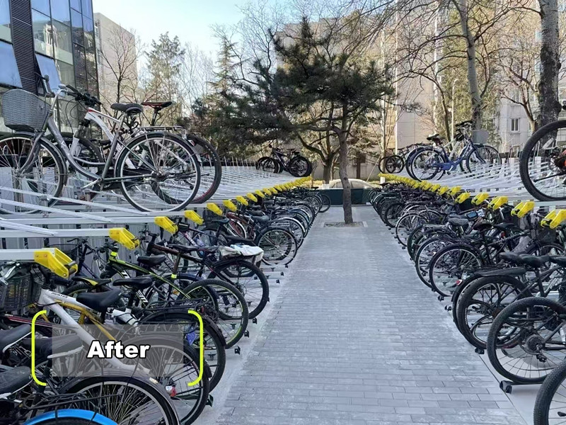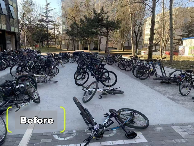 - ก่อนการติดตั้ง: พื้นที่จอดรถจักรยานที่แออัดและยุ่งเหยิง