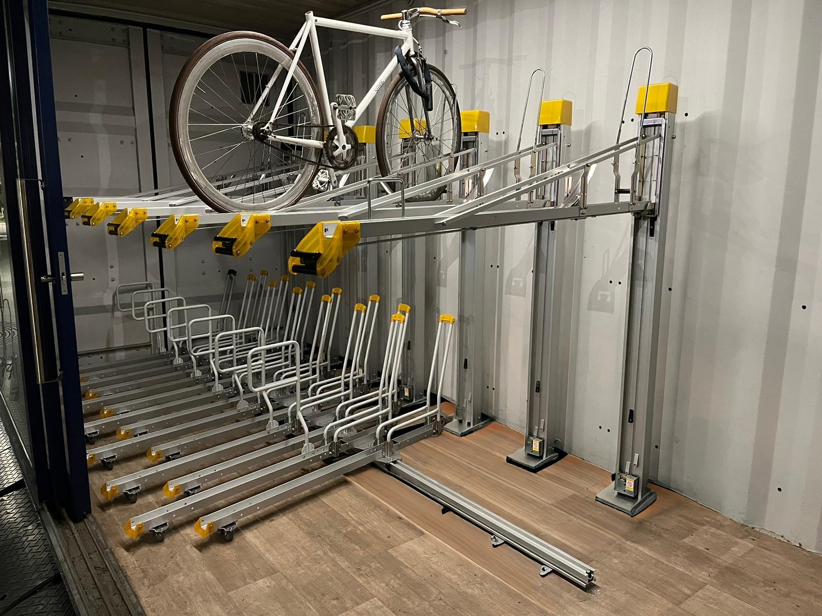 ด้วยโซลูชั่นที่จอดรถสองชั้นของเราสามารถรองรับจักรยานได้ 26 คันในภาชนะขนาด 20 ฟุตและสูงถึง 61 คันในภาชนะ 40 ฟุต หากพื้นที่มี จำกัด ตู้คอนเทนเนอร์ 20 ฟุตจะใช้พื้นที่ที่จอดรถเพียงแห่งเดียวทำให้เหมาะสำหรับการใช้พื้นที่อย่างมีประสิทธิภาพ "